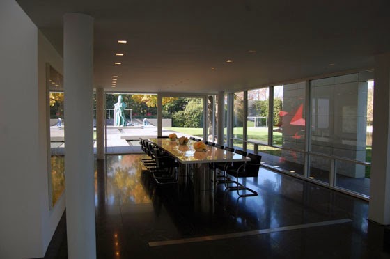 A visit to The Rachofsky House unfolds as a kind of procession through a series of zones, taking one from the outdoors to indoors, and then back outdoors again. All of the spaces of the house, works of contemporary art, and vignettes of the surrounding landscape combine to animate the interiors of the house. Grass, trees, pond and sky are visible from every angle of the house.
